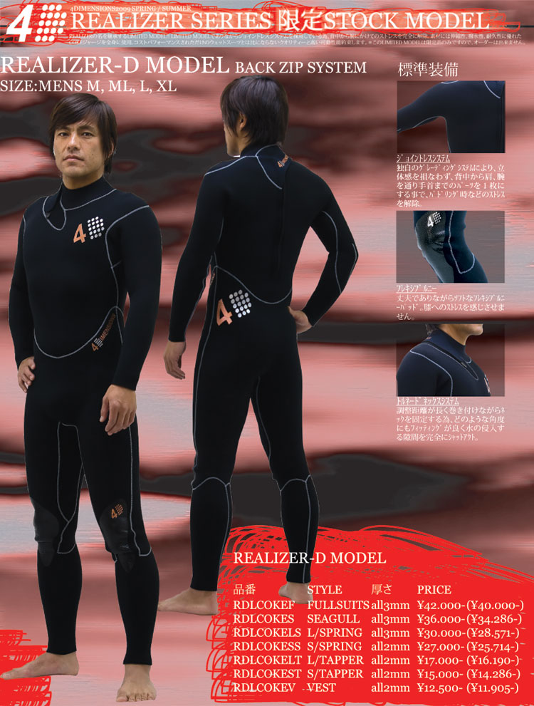 REALIZERの名を継承する限定モデル。限定モデルでありながらジョイントレスシステムを採用しているため、背中から腕にかけてのストラスを完全に解除。素材には伸縮性、撥水性、耐久性に優れたCOKEジャージを全身に使用。コストパフォーマンスされただけのウェットスーツとは比にならないクオリティーと高い稼働性能を約束します。 *このLIMITED MODELは限定品のみですので、オーダーはできません。