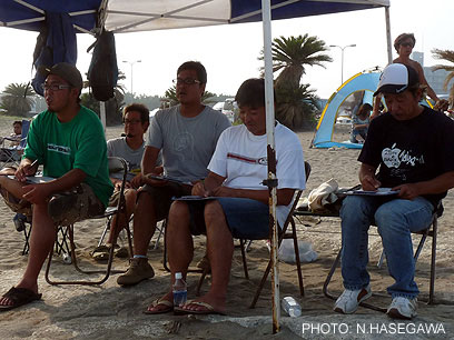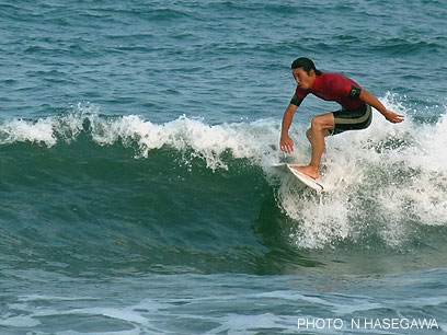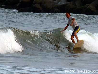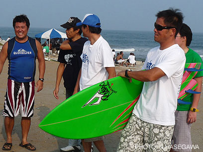 プロサーファーも多数駆け付けており、今最も勢いに乗っている田嶋鉄兵プロをはじめ、3度の日本チャンピオンに輝いた浦山哲也プロ、伊藤勝則プロ、高橋健人プロが来ていました。プロライダーによるエキシビジョンはコンテスト形式で行われ、賞金も出ていました。いいコンディションとは言えない波でエアー、リップ、カットバックをいろんなバリエーションのライディングでギャラリーを楽しませてくれました。
